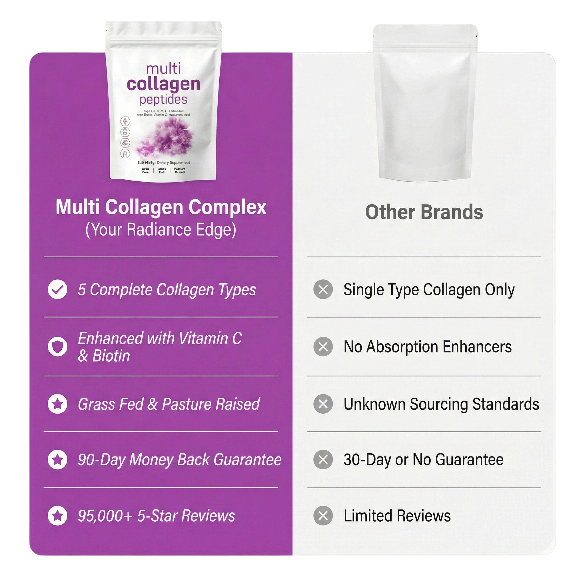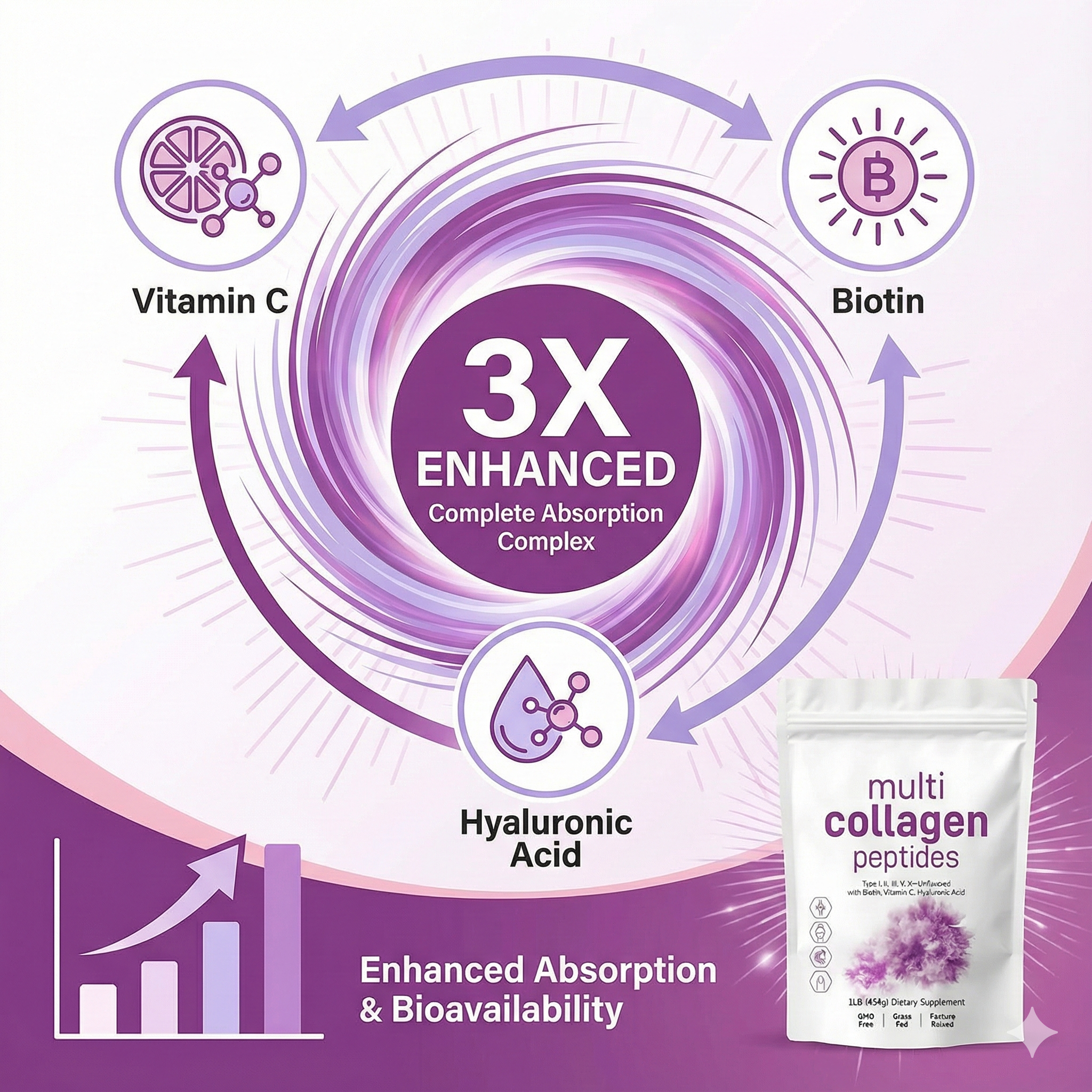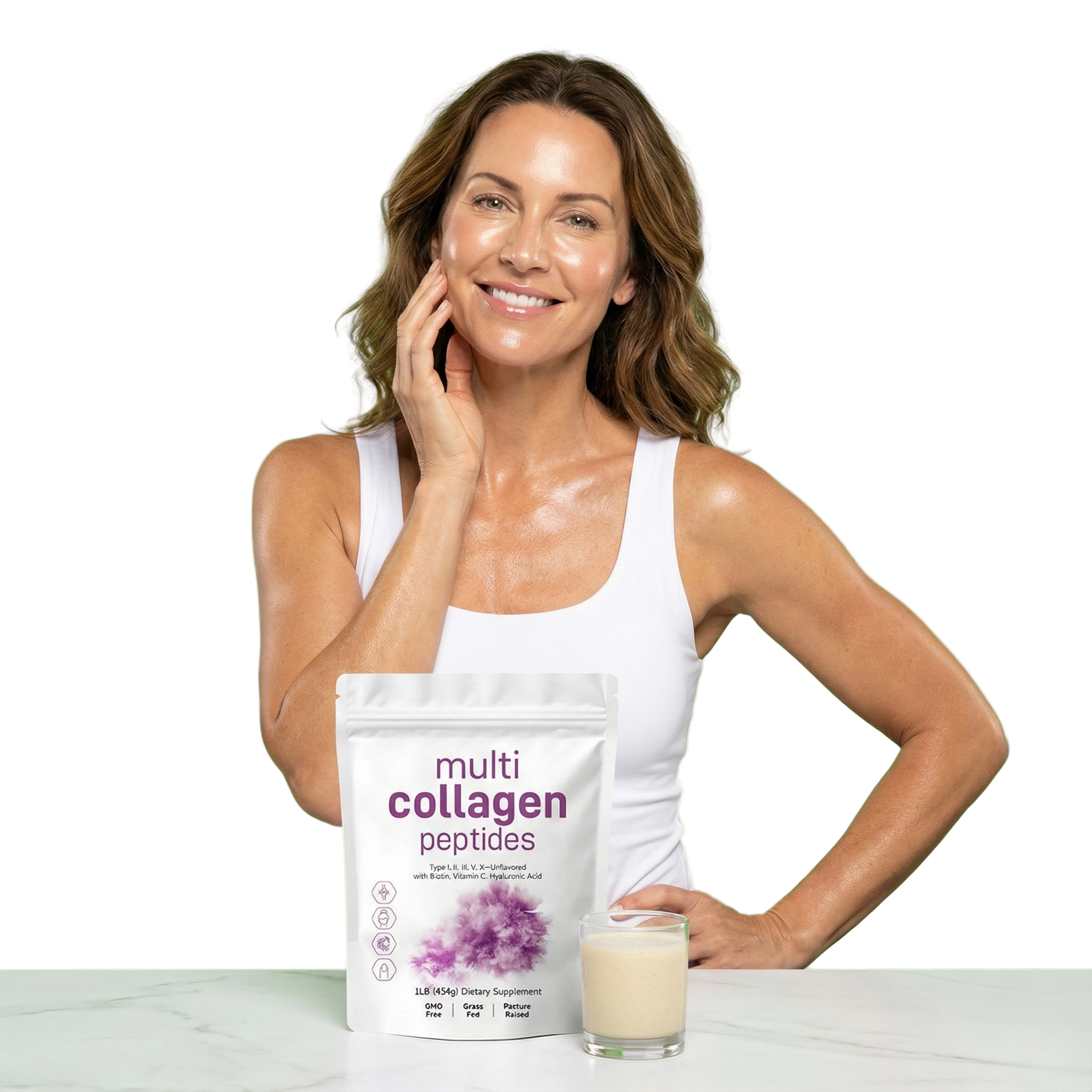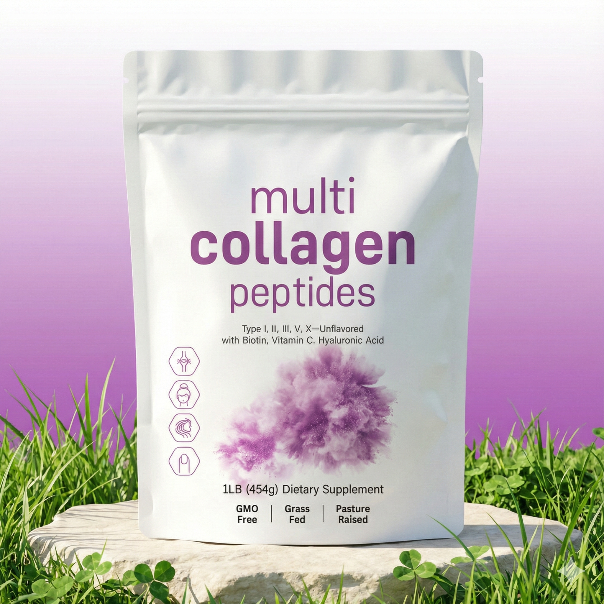Multi Collagen Peptides es el ritual diario 5 en 1 definitivo para quienes buscan una renovación corporal total. Este potente polvo sin sabor aporta los tipos de colágeno más esenciales (tipos I, II, III, V y X), provenientes de membranas premium de bovino, pollo, marino y cáscara de huevo.